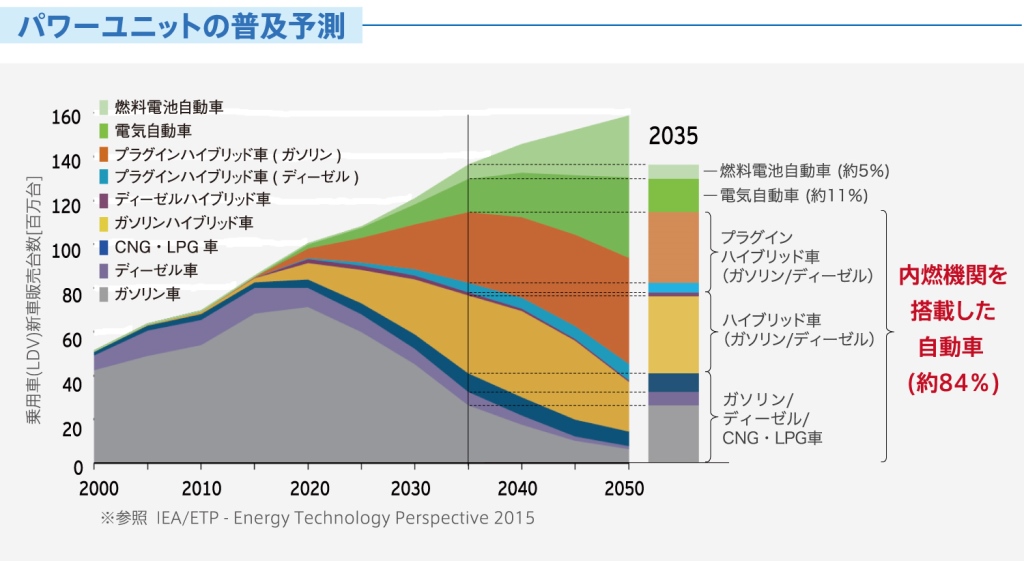 上グラフのように2035年まで、内燃機関搭載エンジン車は右肩上がりになります。私達はその生産ラインを少しでも多く受注しなくてはなりません。5年後電気自動車が走っている率なんて、よくても3パーセントぐらいだと私は考えています。中国でも7パーセントぐらいでしょう。ヨーロッパメーカーの考えるようなフルEVの時代は、みなさんが考えているほど早く進まないでしょう。